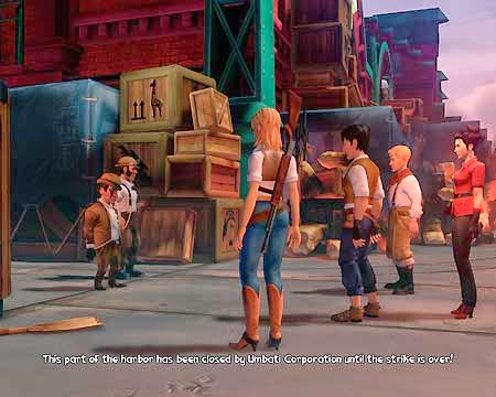 Al acabar el anuncio un zeppelin nuevecito pasa sobre nosotros aterrizando en la cima del poblado. Desembarcan Umbati y compañía, el reencuentro con el enemigo hace saltar chispas de animosidad y no dudamos en indicar a Amanda que dispare al primero que se mueva. El jefe del poblado interviene. Este su territorio, sus leyes, y aquí nadie se pelea a no ser que se enfrenten en la arena, previo pago claro. Deja clara su postura al indicar que sus guerreros nos eliminarán si no guardamos las distancias.