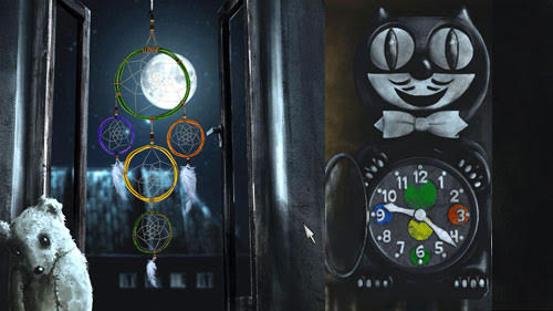 Vertemos el agua de la jarra en la tetera (combinar) y poner ésta sobre los fogones. A la madre le cae un trapo al suelo, lo cogemos regresando al dormitorio. Examinamos el reloj de la pared, lo limpiamos con el trapo, abrimos la esfera y cogemos una pieza del atrapasueños. Miramos por segunda vez el reloj, en el zoom memorizamos las posiciones y colores de los redondeles. Examinamos la ventana, la abrimos con la llave y colgamos el atrapasueños del cordel añadiendo también la pieza suelta.