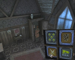 Arriba a la izquierda ponemos las Flores de Lis, Arriba a la derecha el León, Abajo a la izquierda las Espadas y abajo a la derecha el Cañón. Y se nos abre un pasadizo secreto y subimos las escaleras. Entramos por la primera puerta de la derecha a un salón y lo miramos todo y cogemos una llave, salimos y vamos a la siguiente puerta y vemos al fantasma de Clarissa que esta llorando y quiere que la sigamos a través de la chimenea.