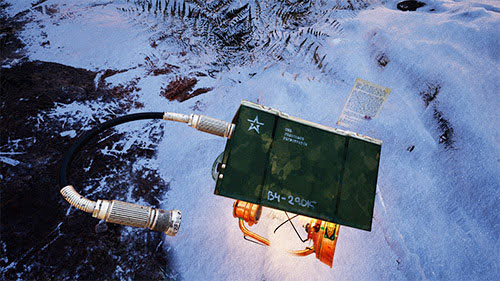 Hemos de tener en cuenta que para escribir y pulsar teclas hay que usar el teclado DE ESE ORDENADOR habiendo de acercarnos lo máximo posible para ver que son seleccionables, por tanto pulsamos la tecla TAB de ahí. De entre las notas que hemos cogido a los soldados muertos, una a de las anotaciones destacadas ha de ser la contraseña, en este caso: OCT23. Tal y como lo escribimos salta un aviso a lo burro que el generador carece de combustible. En el suelo a la izquierda de la radio hay una garrafa de gasolina, la cogemos.