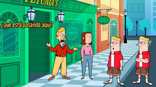 Le preguntaremos si sabe dónde podría estar el ladrón para desbloquear la ubicación del parque. Vamos ante la tienda de Susan, pedimos al chaval del traje de pollo que firme su testimonio, acepta. De paso preguntamos si conoce el paradero de Juanita, oh, lo sabe, no está en la biblioteca sino en los billares. Miramos de nuevo los letreros de la pared que antes vimos del torneo y la ubicación del Bar Petunias se añade al mapa. Nos desplazamos a ese bar, miramos el cartel de la puerta escrito con tiza, conseguimos una.
