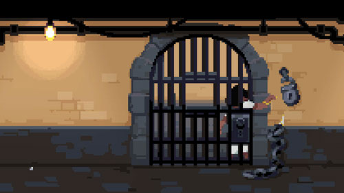 Diana. Echamos un vistazo a la celda y a través de los barrotes para ver el pasillo y la cadena con candado. Volvemos a la vista del interior de la celda.