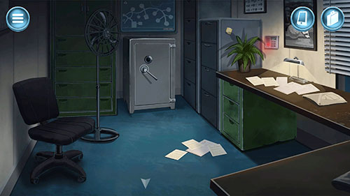 Examinamos la caja fuerte, desconocemos la contraseña, buscaremos pistas alrededor en su busca. Miramos el sticker amarillo pegado al archivador, pone algo de “tigre, molino, cascada”, ha de ser una pista. Examinamos el mapa del parque por encima de la caja fuerte fijándonos en los números de los hoyos mencionados en el sticker: tigre 5, molino 1, cascada 6. Pulsamos de nuevo en la caja fuerte, tocamos en los números 50-10-60 y se abre. En su interior hay mucho dinero, lo cogemos.